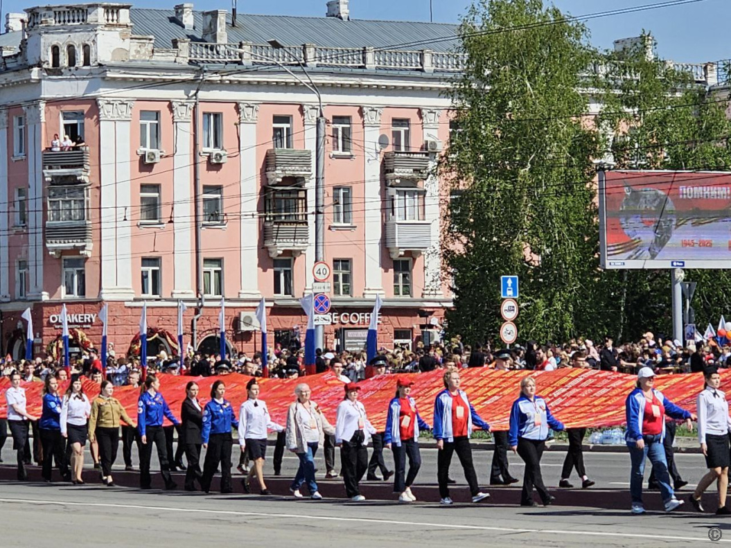 Шествие "Бессмертного полка" открылось выносом знамени Победы длиной 207 метров. Его сшили из 6210 лоскутов, которые прислали жители Алтайского края в рамках межрегиональной акции. Каждый участник акции вышил на своем лоскуте имена членов своей семьи - участников Великой Отечественной войны, специальной военной операции и других локальных вооруженных конфликтов. В результате, получилось полотно длиной 207 метров.