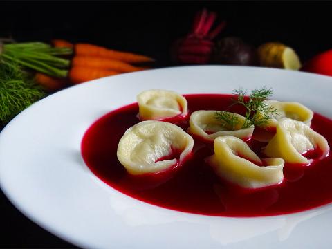 Второе блюдо - красный борщ с пельменями (Barszcz czerwony z uszkami).