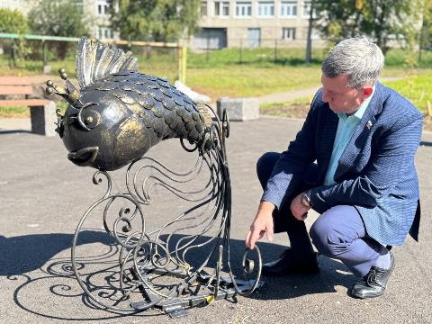 В рамках конкурса инициативных проектов «Есть Решение», здесь заасфальтировали площадку, установили лавочки с урнами, по периметру высадили 20 кустов рябины. Главным украшением объекта стали кованные фигуры персонажей народных сказок – щука и две золотые рыбки.