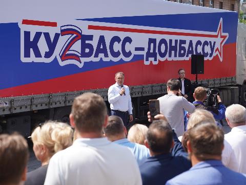Напутствуя экипажи грузовиков, губернатор Кемеровской области Илья Середюк отметил, что "мы всем сердцем переживаем происходящее в этом прифронтовом городе".