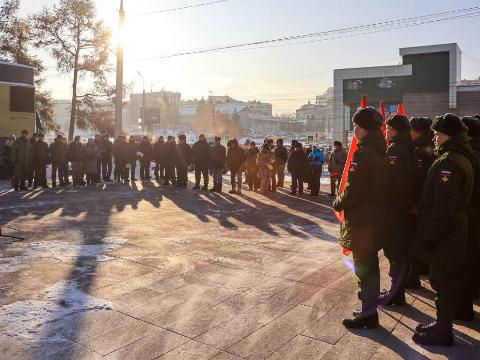 Митинг в Иркутске состоялся на площади Декабристов, на которой установлен мемориал "Иркутянам, погибшим при исполнении воинского долга" и скульптурная композиция "Дед, Отец, Сын", олицетворяющая поколения защитников Отечества.