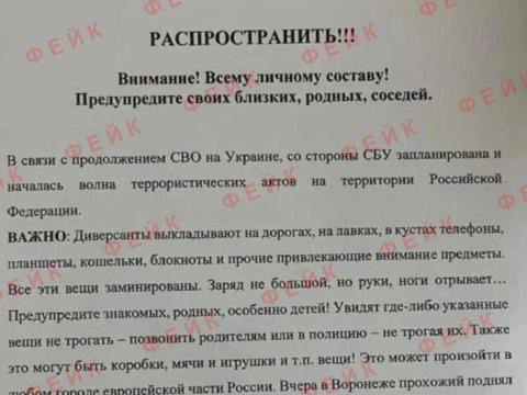 Благовещенцы стали свидетелями распространения нового фейка, начинающегося с предупреждения: "Внимание! Всему личному составу!" В тексте утверждается, что на улицах разбрасываются заминированные предметы: телефоны, кошельки и игрушки. Далее в этом сообщении говорится, что Служба безопасности Украины (СБУ) якобы планирует серию террористических актов на территории России, сообщает "Priamur.Media".
