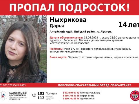 В Алтайском крае продолжаются поиски 14-летней Дарьи Ныхриковой, которая пропала в селе Лесном Бийского района. Девушка вышла из дома около полуночи 16 июня, и с тех пор о ней нет никаких известий. Поисково-спасательный отряд "СпасАлтай22" распространил ориентировку с приметами и фотографией пропавшей.