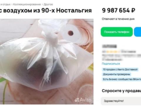 В Иркутске на сайте бесплатных объявлений появилось необычное предложение: пакеты с воздухом из 90-х годов. Продавец выставил на продажу пять таких упаковок и утверждает, что это идеальный подарок для тех, кто ностальгирует по этому времени.