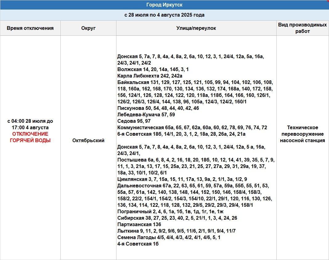 Без горячей ванны на неделю останутся некоторые жители улиц Карла Либкнехта, Донской, Волжской, Партизанской, Лыткина, Байкальской, Пискунова, Лебедева-Кумача, Коммунистической, 6-й Советской, Седова, Постышева, Цимлянской, Дальневосточной, Сибирской, Семена Лагоды, 4-й Советской и Пограничного переулка.