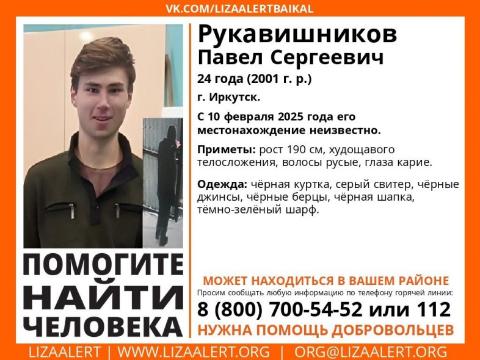 Волонтёры поискового отряда «ЛизаАлерт» в Иркутской области обратились за помощью в поиске 24-летнего Павла Сергеевича Рукавишникова к своим коллегам из Карелии. Молодой человек пропал 10 февраля в Иркутске. Об этом сообщили в группе «ЛизаАлерт» в Карелии.