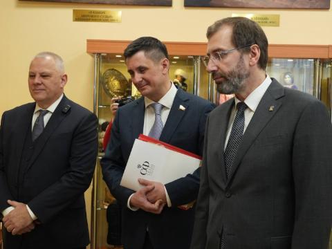 Председатель Законодательного собрания Иркутской области Александр Ведерников и сенатор Российской Федерации Вадим Деньгин посетили выставку, посвященную судьям-фронтовикам, которая проходит в Иркутском областном суде.